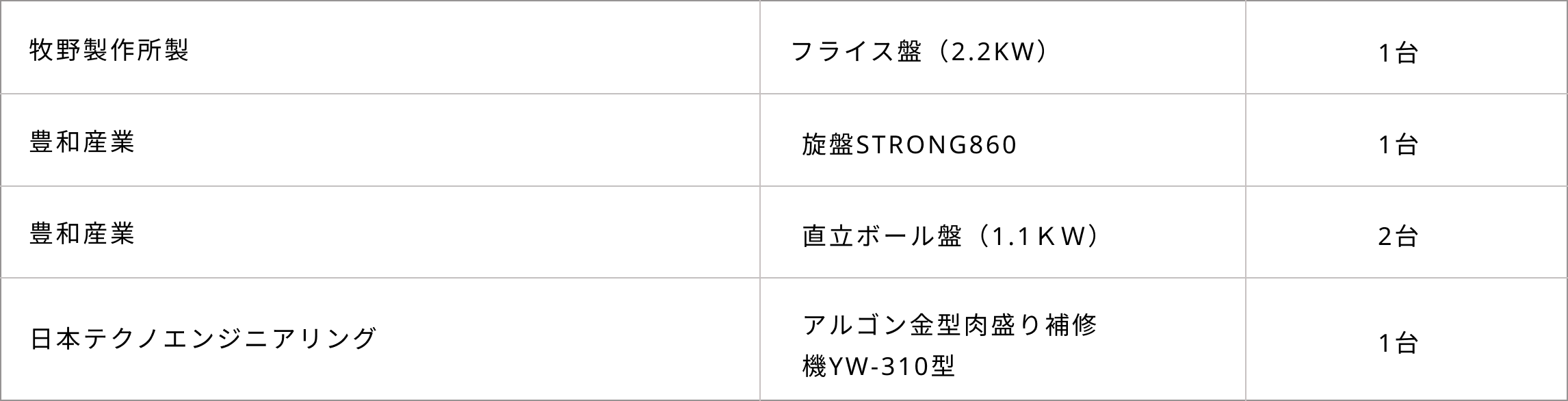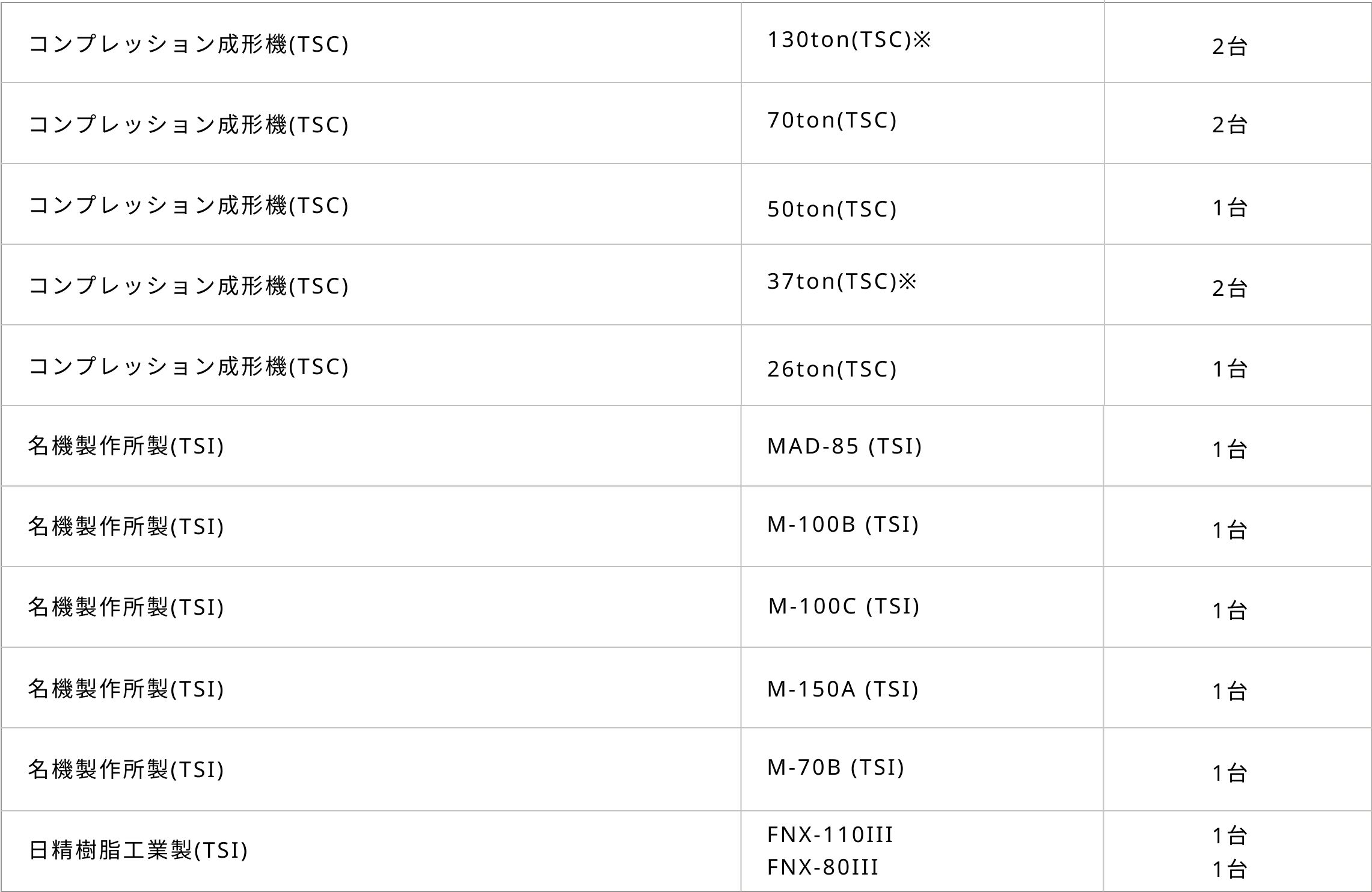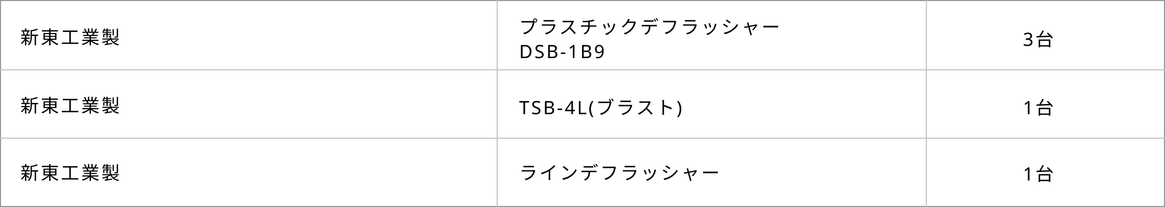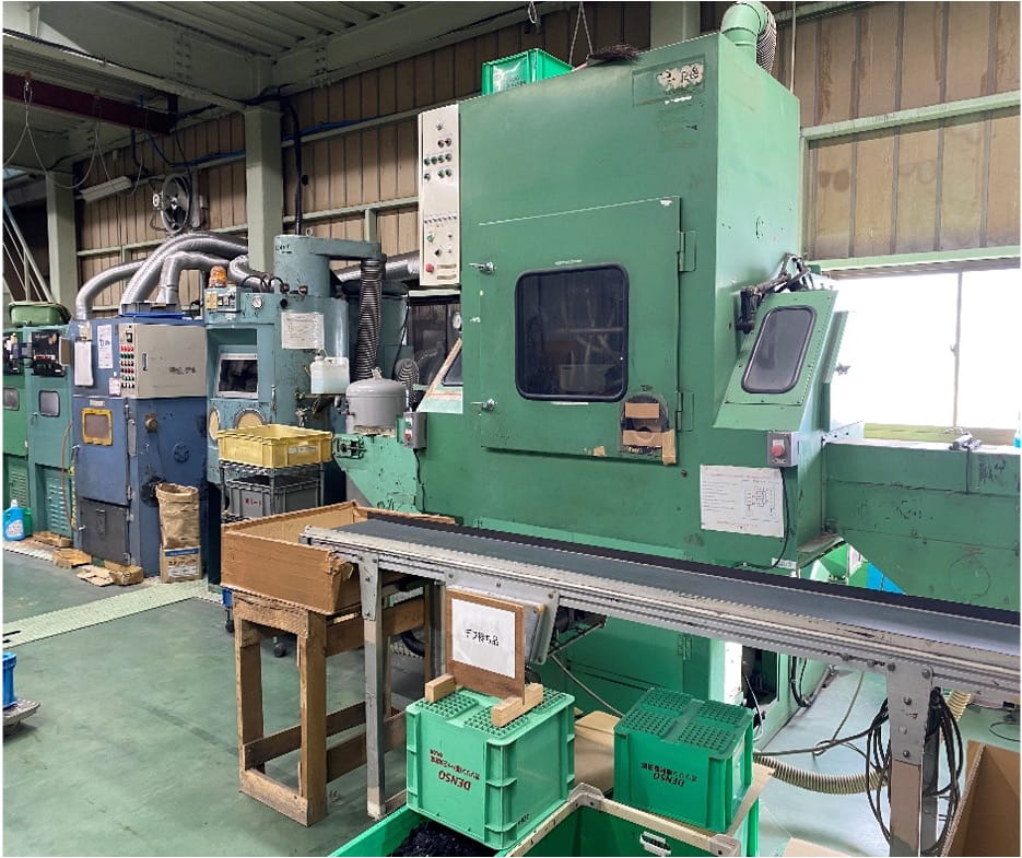 熱硬化性樹脂の製造ラインの成型機7台とバリ取り装置を配しております。 熱可塑性樹脂の製造ラインを第一工場に移すことで、熱硬化性樹脂製品製造時に出る粉塵が熱可塑性樹脂製品に混入することがなくなりました。 また、金型の汚れを完璧に取り除き新型の鋼色に戻す金型専用洗浄機「クリピカエースⅢ」を導入しました。 これにより、品質は向上し納期の短縮を図ることが出来るようになりました。